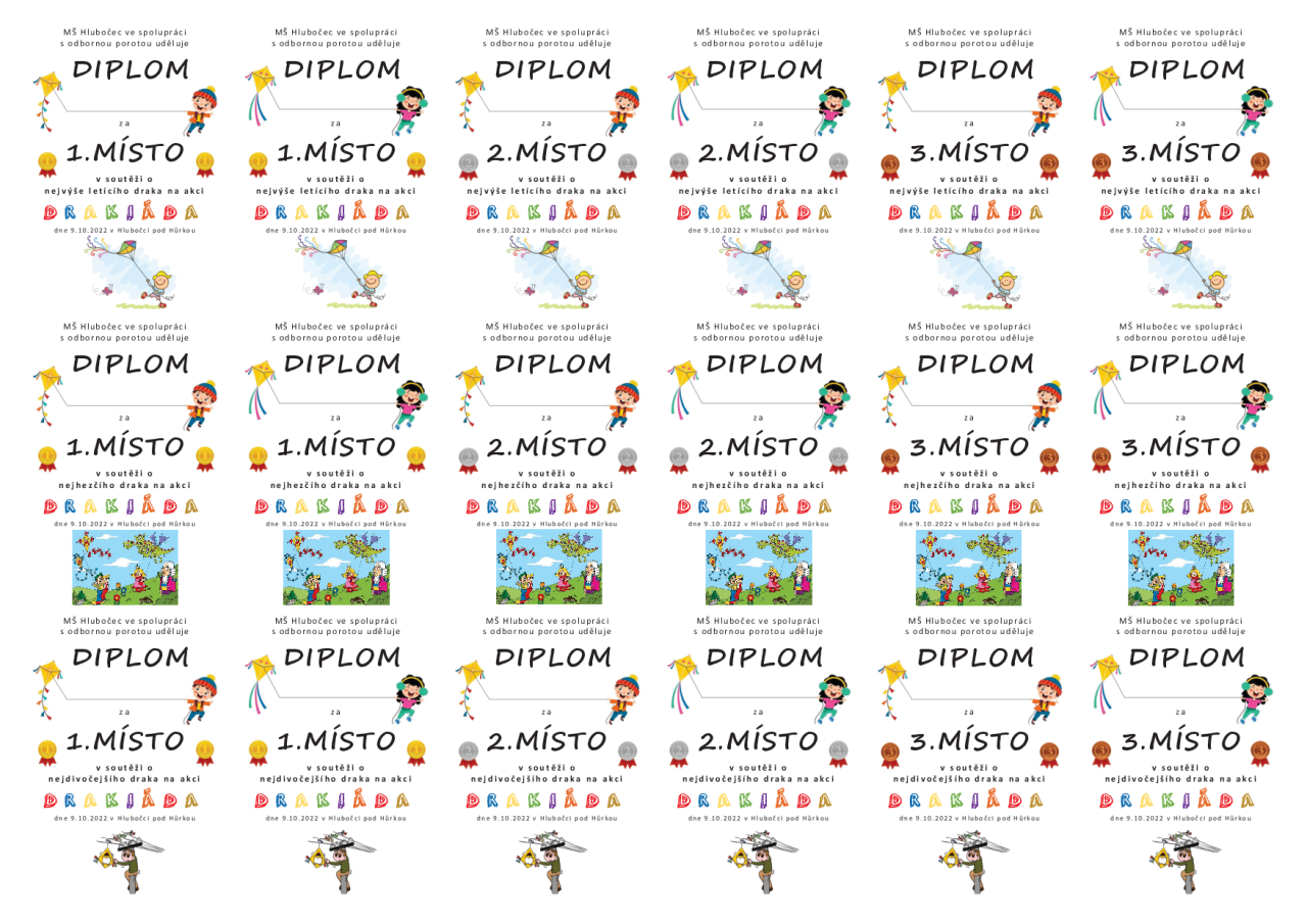 Na hlubočské Drakiádě se sešlo na 30 nádherných draků všech velikostí, tvarů a barev, kteří dělali radost zhruba 50-ti dětem. Draky se nám nakonec podařilo dostat do vzduchu, ale díky slabému větru nebylo výjimkou, že se nám je vždy nedařilo udržet nad námi. Pro děti bylo připraveno vyhodnocení draků v kategorii – Nejkrásnější, Nejvýše letící a Nejdivočejší. Ocenění výherci, kterým tímto ještě jednou gratulujeme, si odnesli diplom a drobné ceny. Pro ostatní bylo malou útěchou alespoň udělení účastnického listu a drobných sladkostí.